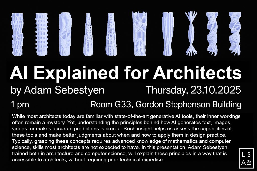 October 2025: Guest Lecture: AI explained for Architects, by Adam Sebestyen, TU Graz, G33 in the Gordon Stephenson building on 23rd October, at 1pm.